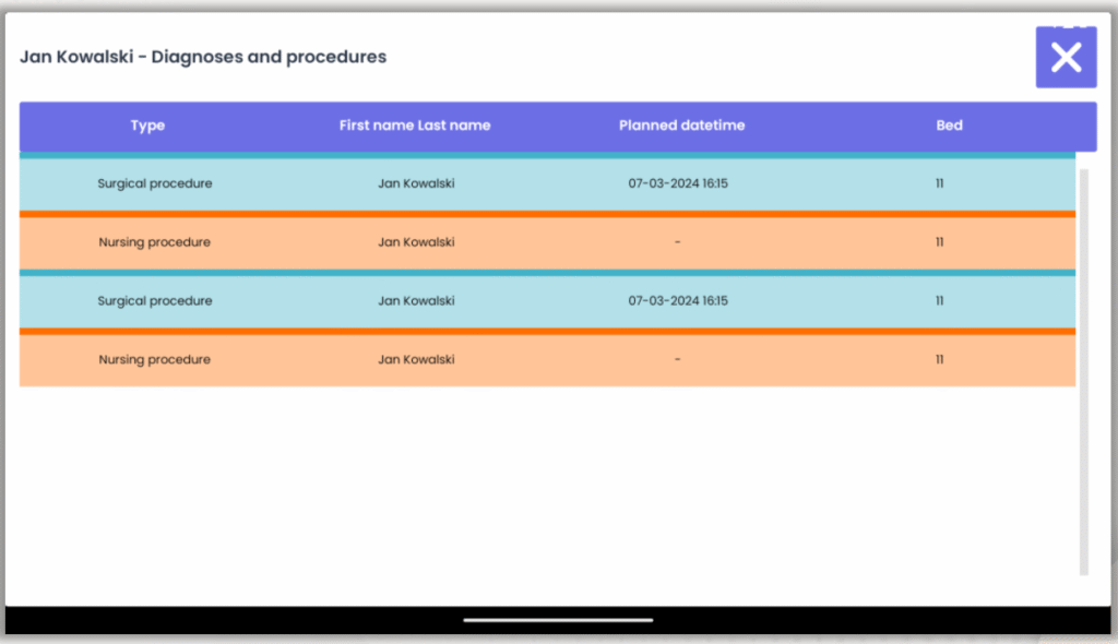 Zbiorczy podgląd zdarzeń umożliwia personelowi szybki dostęp do wszystkich aktywnych informacji dotyczących pacjentów na oddziale. Na ekranie w dyżurce prezentowane są zdarzenia, alerty i zlecenia w czasie rzeczywistym, co pozwala na natychmiastową reakcję i skuteczniejsze zarządzanie obowiązkami. Dzięki temu rozwiązaniu cały zespół ma stały wgląd w aktualną sytuację kliniczną, co zwiększa płynność pracy i bezpieczeństwo pacjentów.